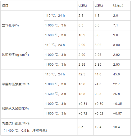 按GB/T 2997⎯2000检测试样烘后和热处理后的显气孔率和体积密度,按GB/T 5072⎯2008检测试样烘后和热处理后的常温耐压强度,按GB/T 5988⎯2007检测试样热处理后的加热永久线变化率,按GB/T 3002⎯2017检测试样热处理后在埋炭(焦炭)气氛下于1 400 ℃保温0.5 h的高温抗折强度。