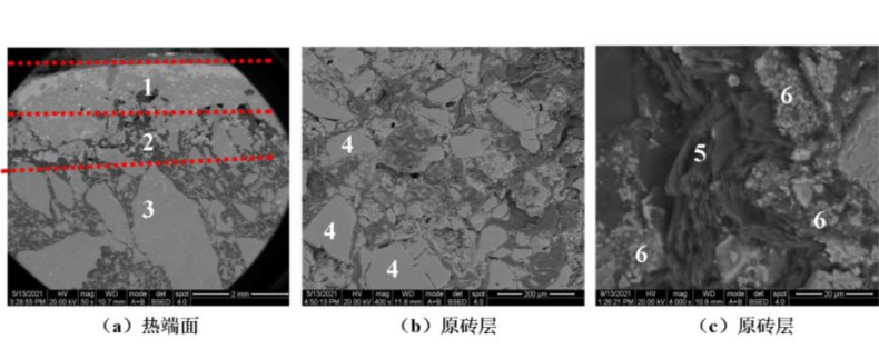 1—反应渗透层;2—氧化层;3—原砖层;4—电熔镁砂;5—鳞片石墨;6—原位尖晶石相。
