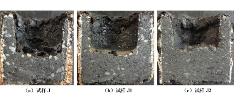 图2示出了抗渣试验后坩埚试样的剖面照片。可以看出:试样J、J1和J2抗渣试验后的侵蚀深度分别为0.6、0.4、0.4 mm,侵蚀宽度分别为1.4、1.1、1.3 mm,试样的抗渣性比较接近。