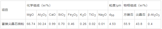 表1 富镁尖晶石微粉的化学组成、物相组成及粒度