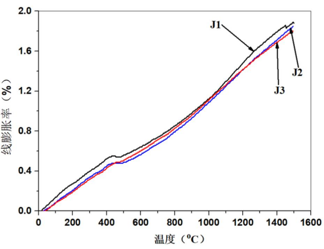 烘干后试样在还原气氛下从室温上升至1 500 ℃时的高温线膨胀率如图3所示。可以看出,与试样J1相比,试样J2和J3的高温线膨胀率要相对略小。